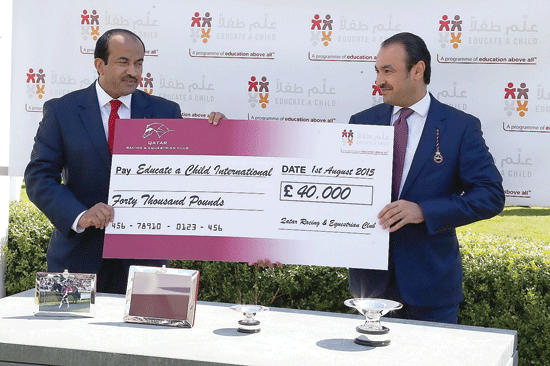 The donation comes from proceeds of one of the races during the five-day Qatar Goodwood Festival in the UK to support EAC's projects providing access to primary education around the world. 'Educate A Child Stakes' is the name of the race dedicated to EAC. Rashid Al Dehaimi, Representative of the Qatari embassy in London, received the cheque on behalf of EAA.